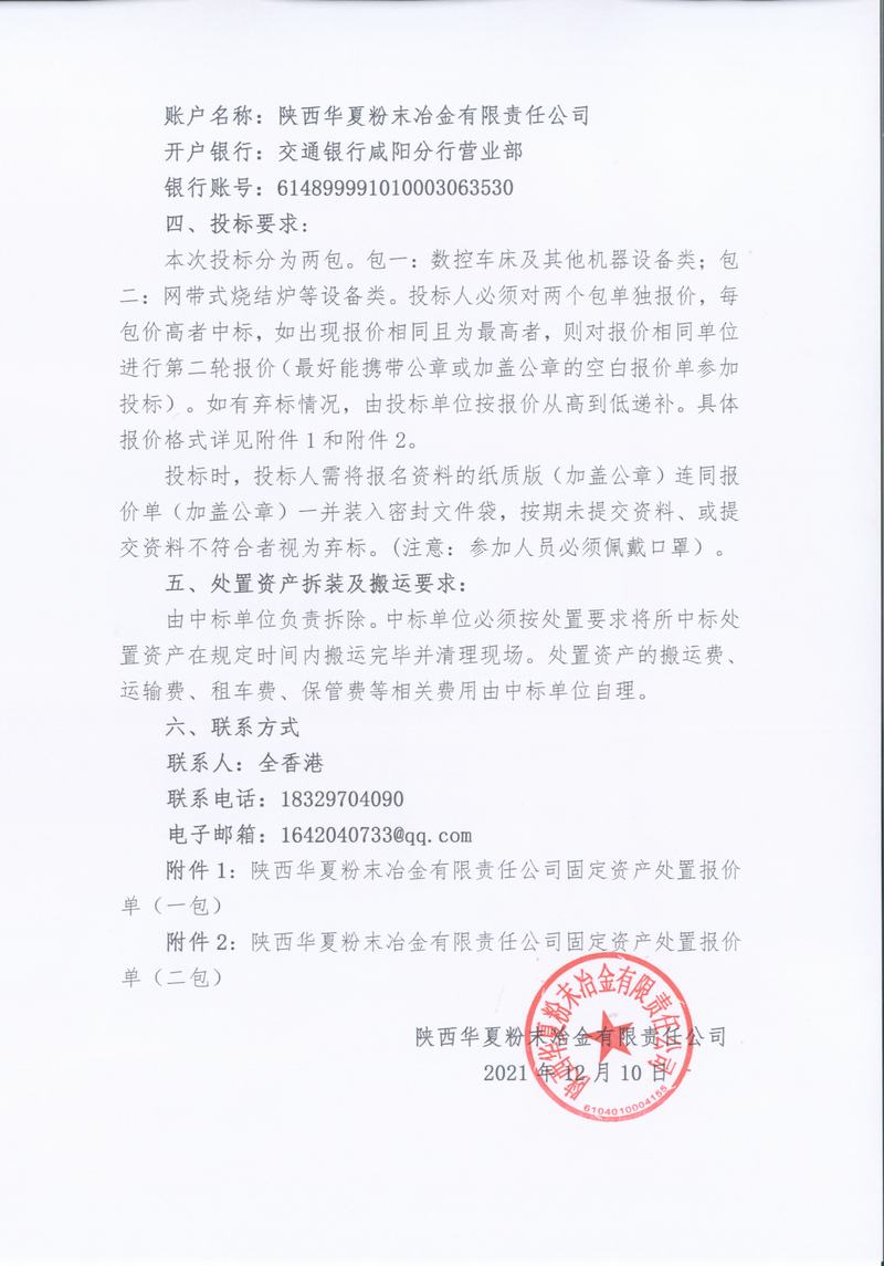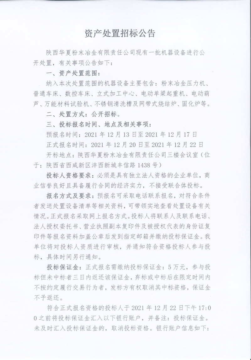 陜西華夏粉末冶金有限責(zé)任公司現(xiàn)有一批機器設(shè)備進行公開處置,有關(guān)事項公告如下: