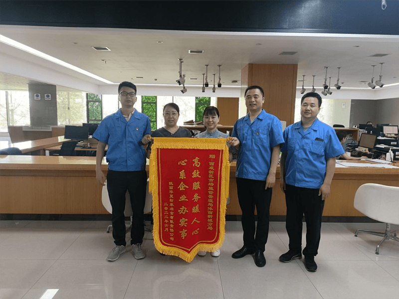 6月16日上午,華夏公司總經(jīng)理左鵬軍率領(lǐng)公司副總經(jīng)理楊聰斌、財務(wù)總監(jiān)康國濤等一行,將一面印有“高效服務(wù)暖人心、心系企業(yè)辦實事”的錦旗送到西咸新區(qū)市場監(jiān)督管理局灃西新城分局,對灃西新城市監(jiān)局在華夏公司住所變更等事宜中給予傾心服務(wù)和有力保障表示衷心的感謝。